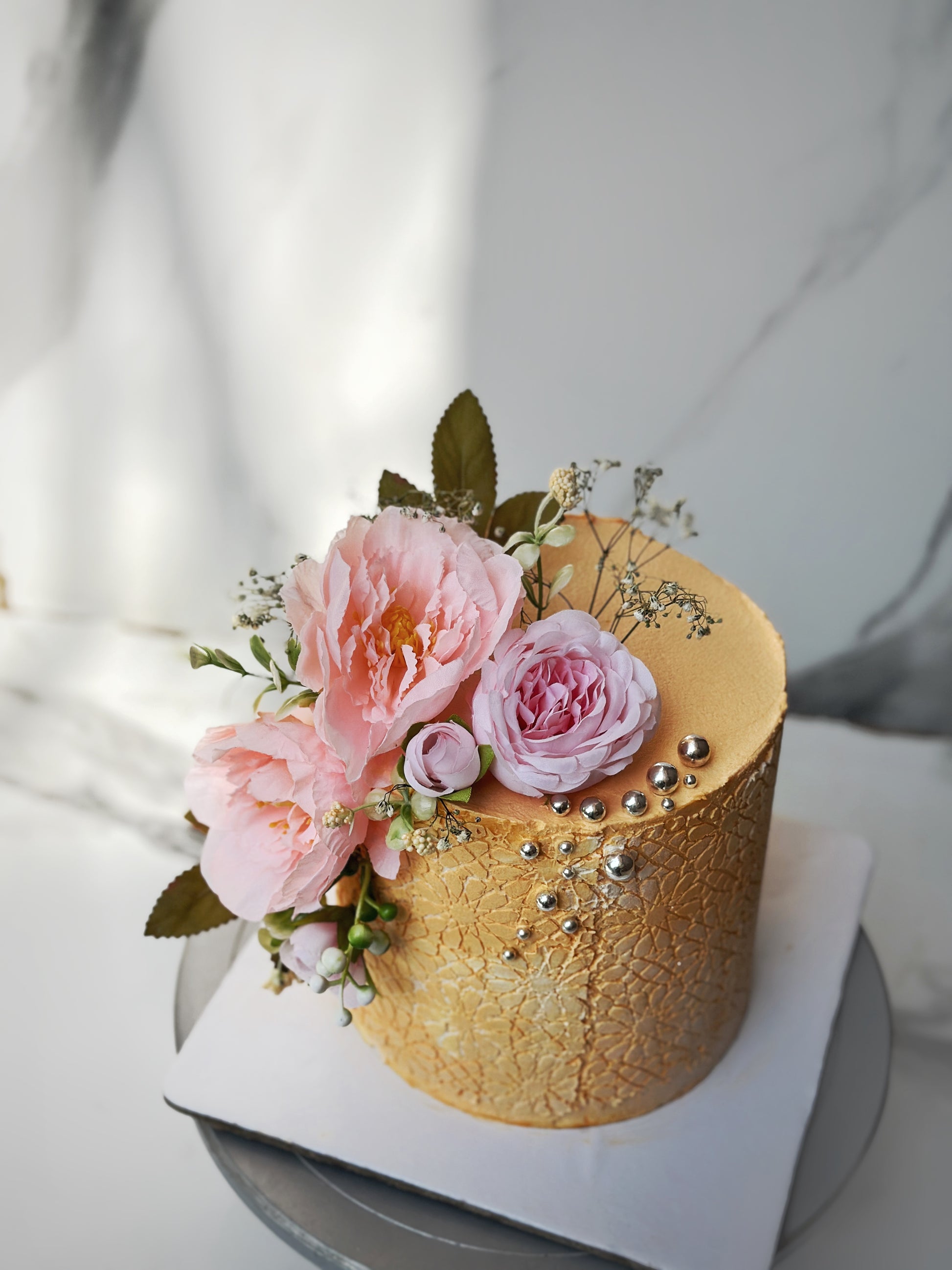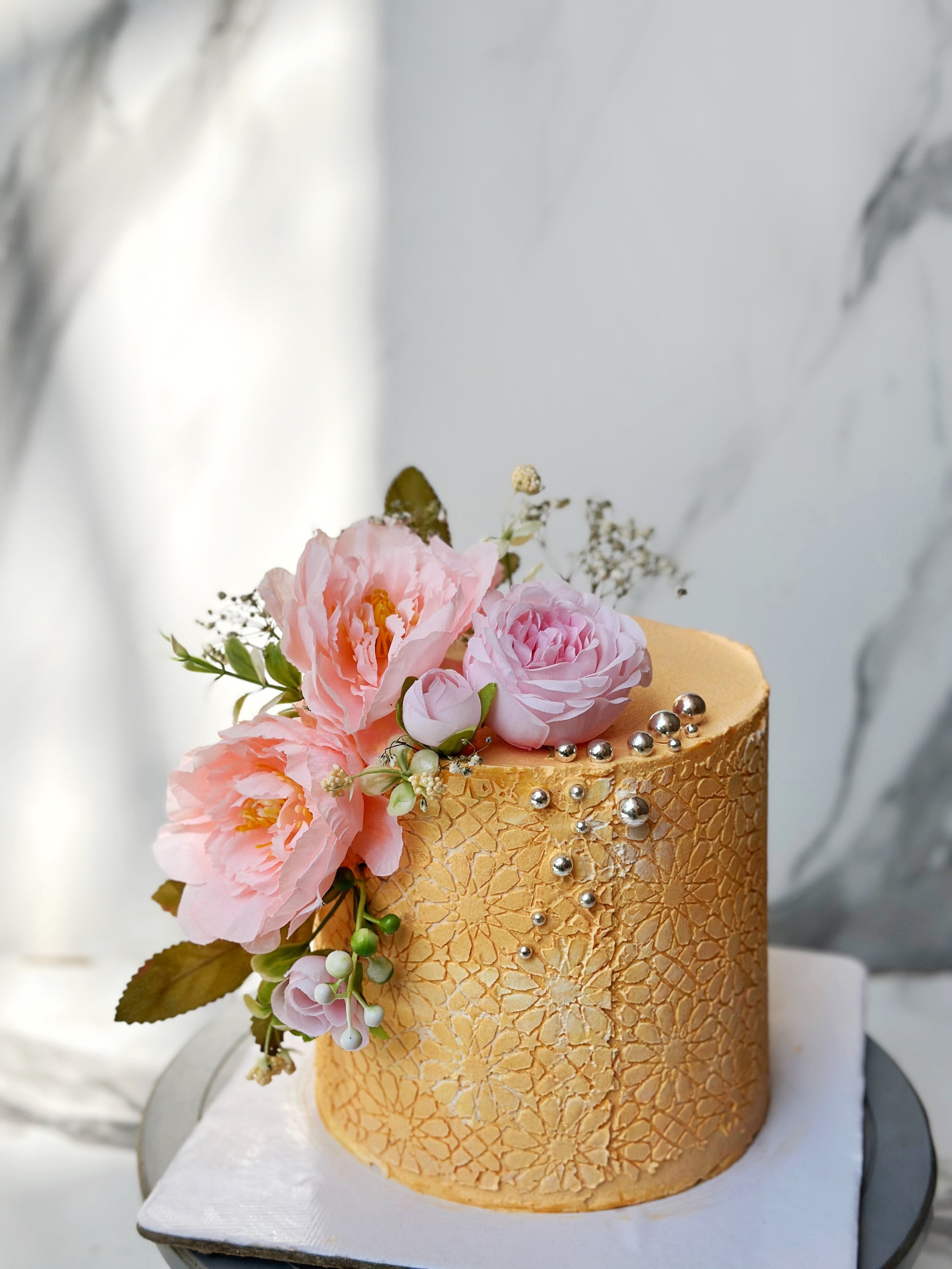 Belgium chocolate flavour with buttercream frosting and fake floral work
