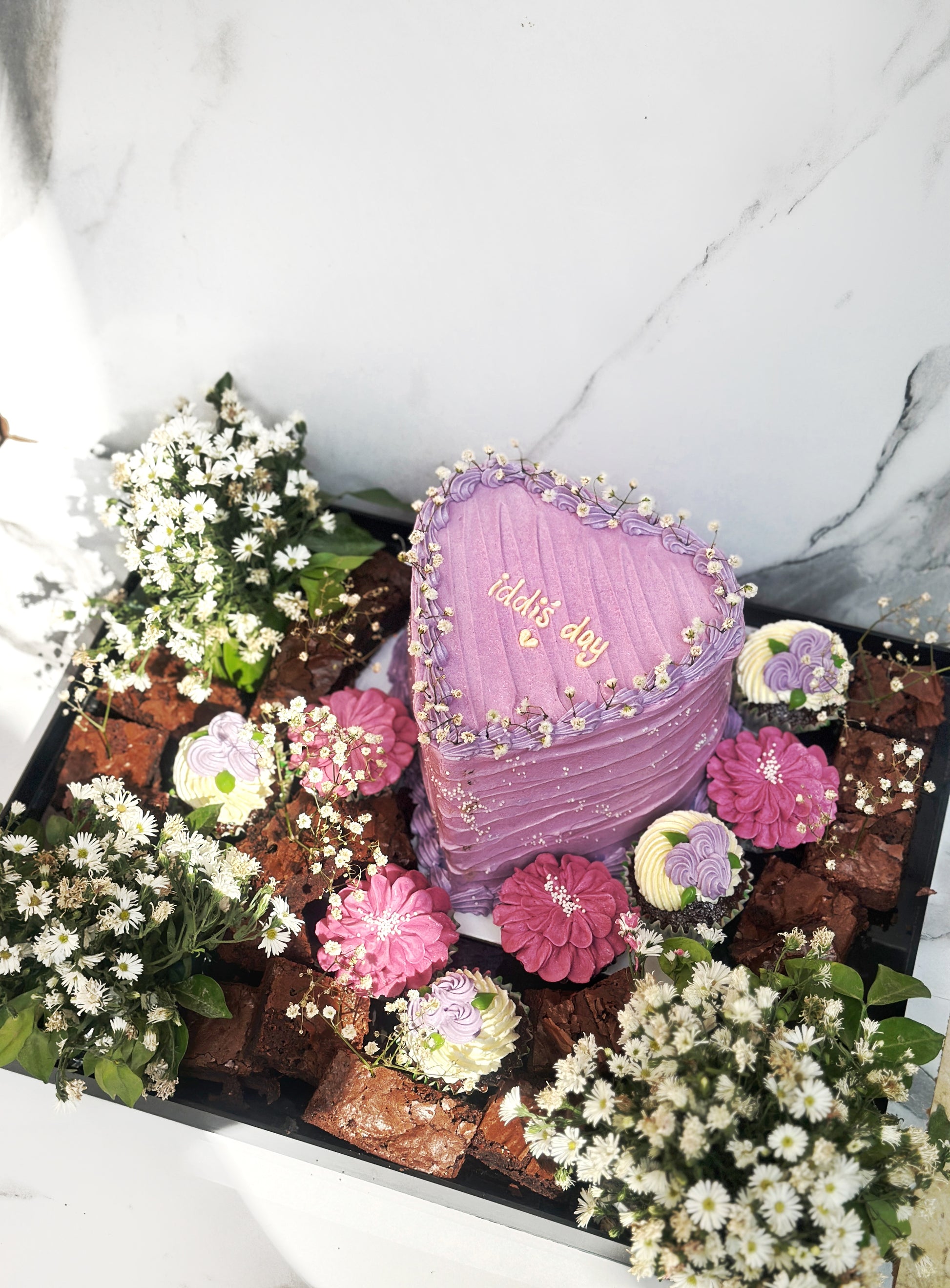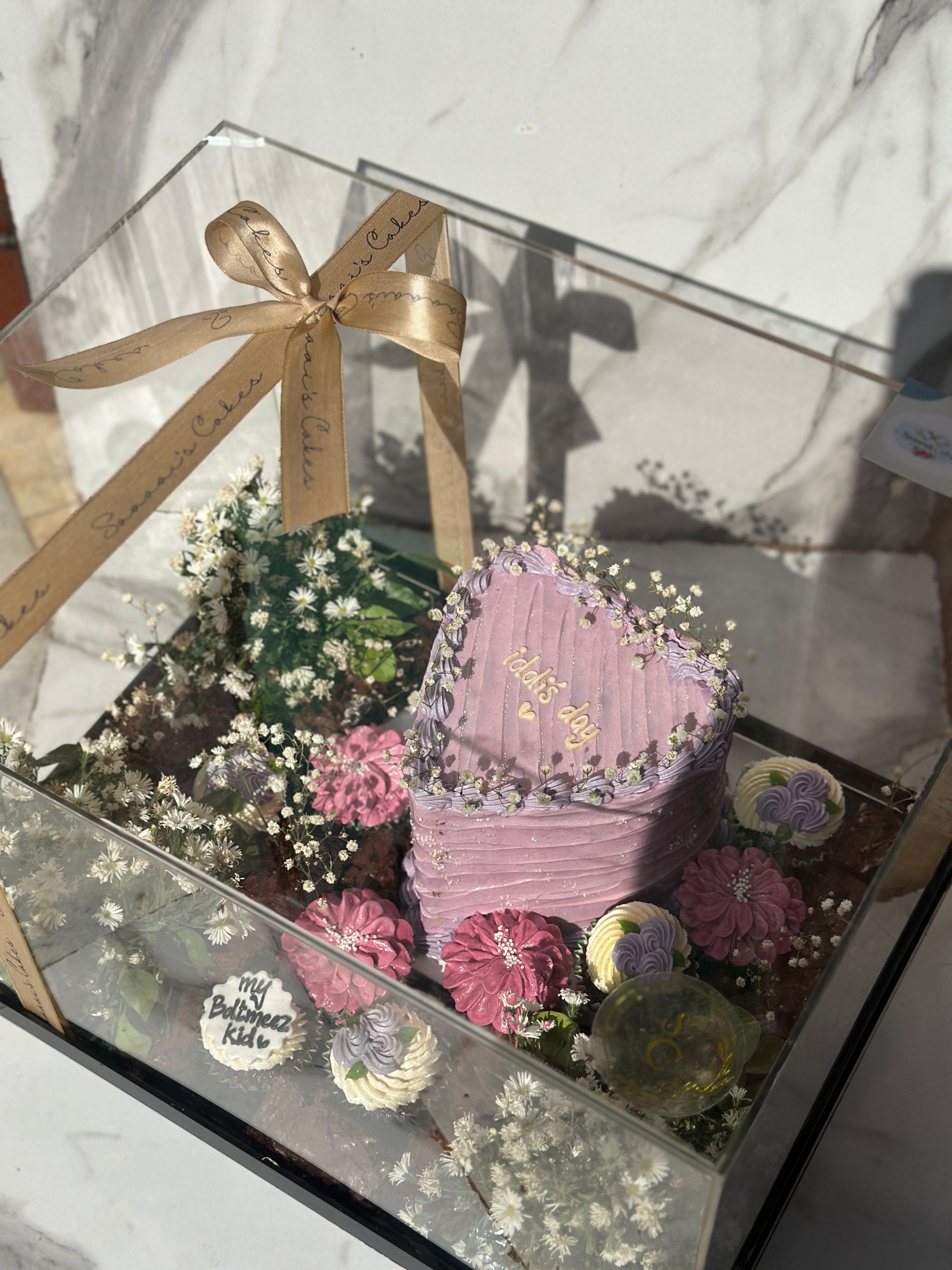 Luxury gifting box, includes a 3.5 pound cake, brownies, cupcakes & floral decor packed in a giant acrylic box.
