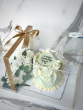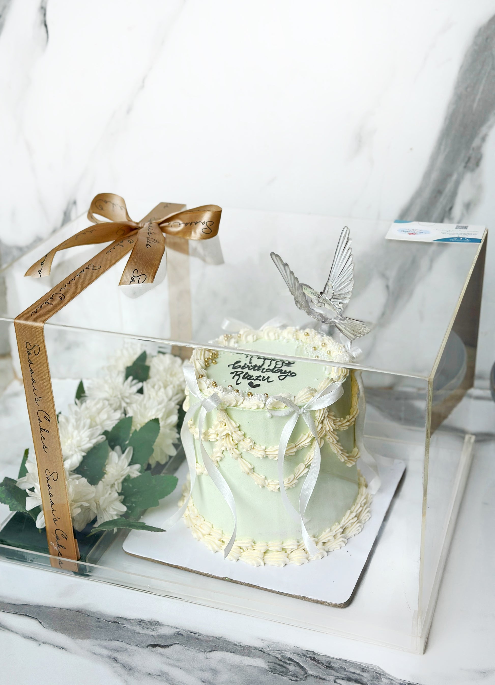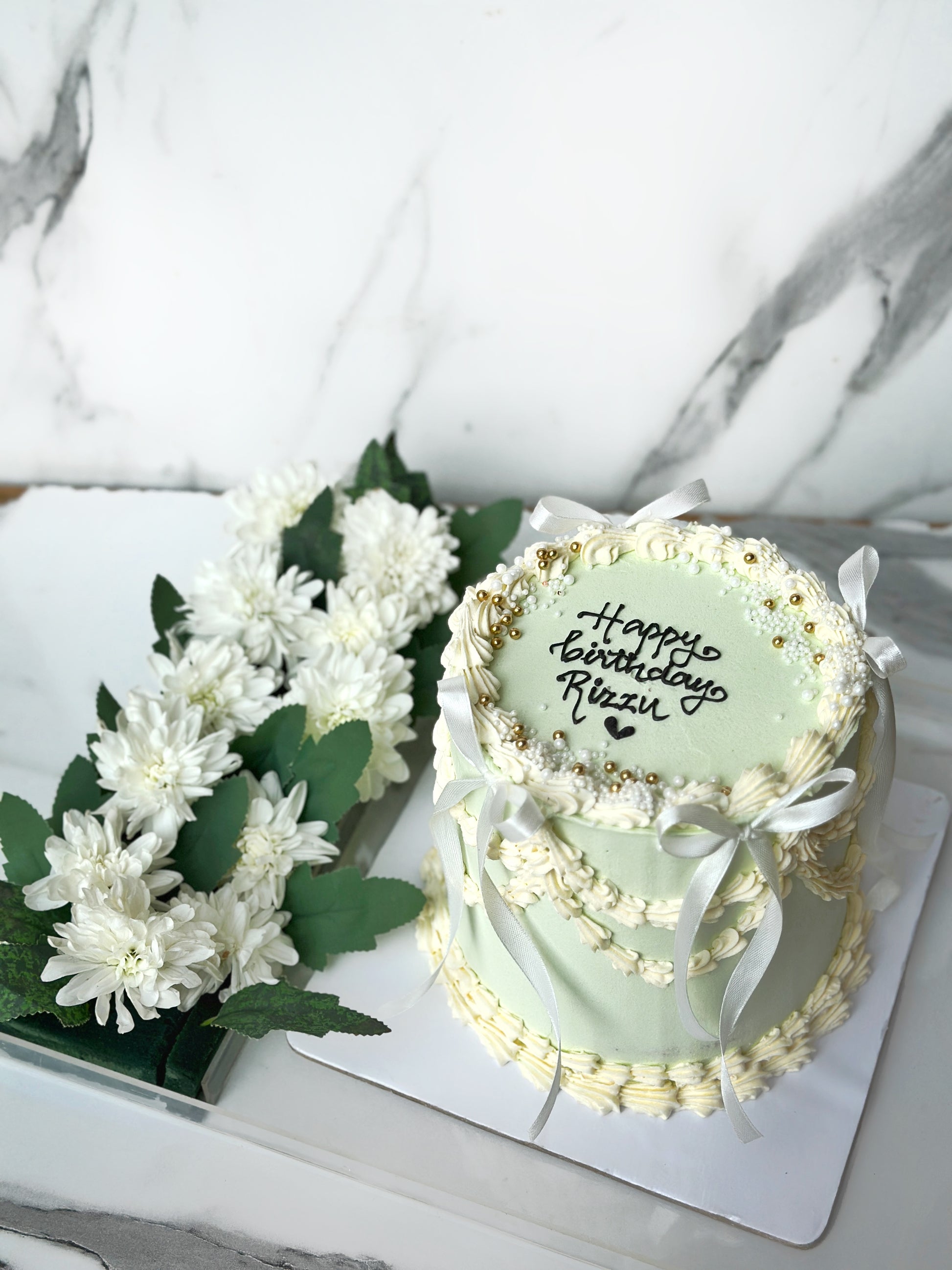 4 pound vintage theme cake with fresh flowers on the side.